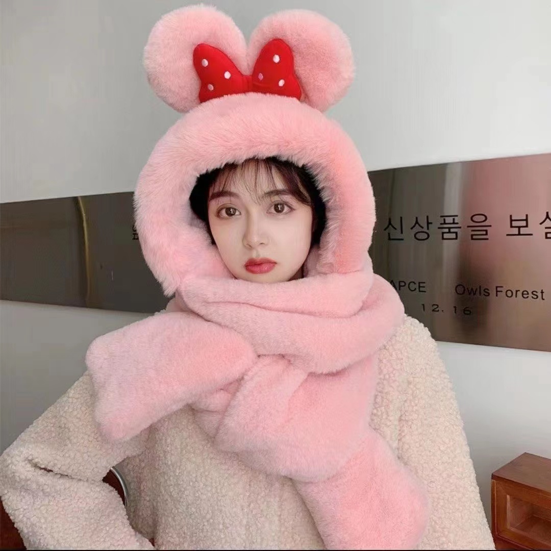 Thick Hat Women Autumn And Winter Cute Warm Plush Scarf One Ear Protection Windproof Bib Bear Three-Piece Set